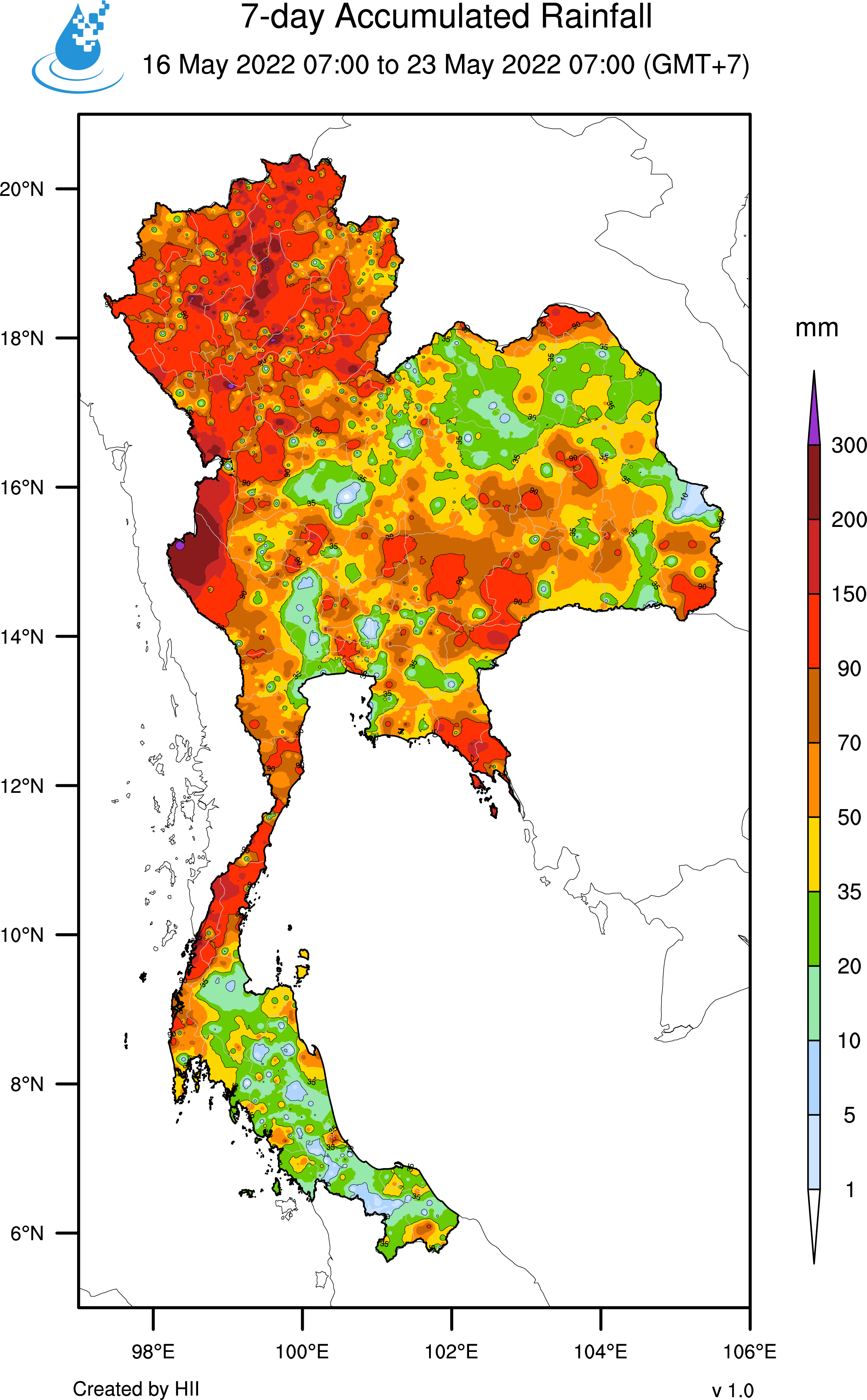 Thailand, especially in the North and the Central that experienced heavy to very heavy rains in many areas. During 16-23 May 2022, provinces facing very heavy rains with more than 90 millimeters per day were Chiangmai, Chiangrai, Lamphun, Lampang, Mae Hong Son, Phrae, Uttaradit, Nan, Sukhothai, Phitsanulok, Kamphaeng Phet, Tak, and Kanchanaburi.