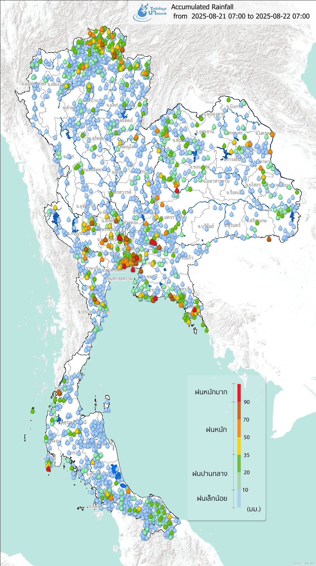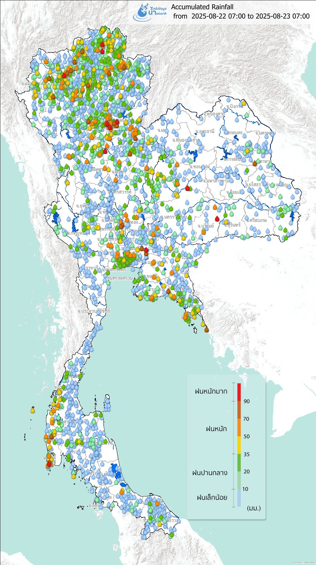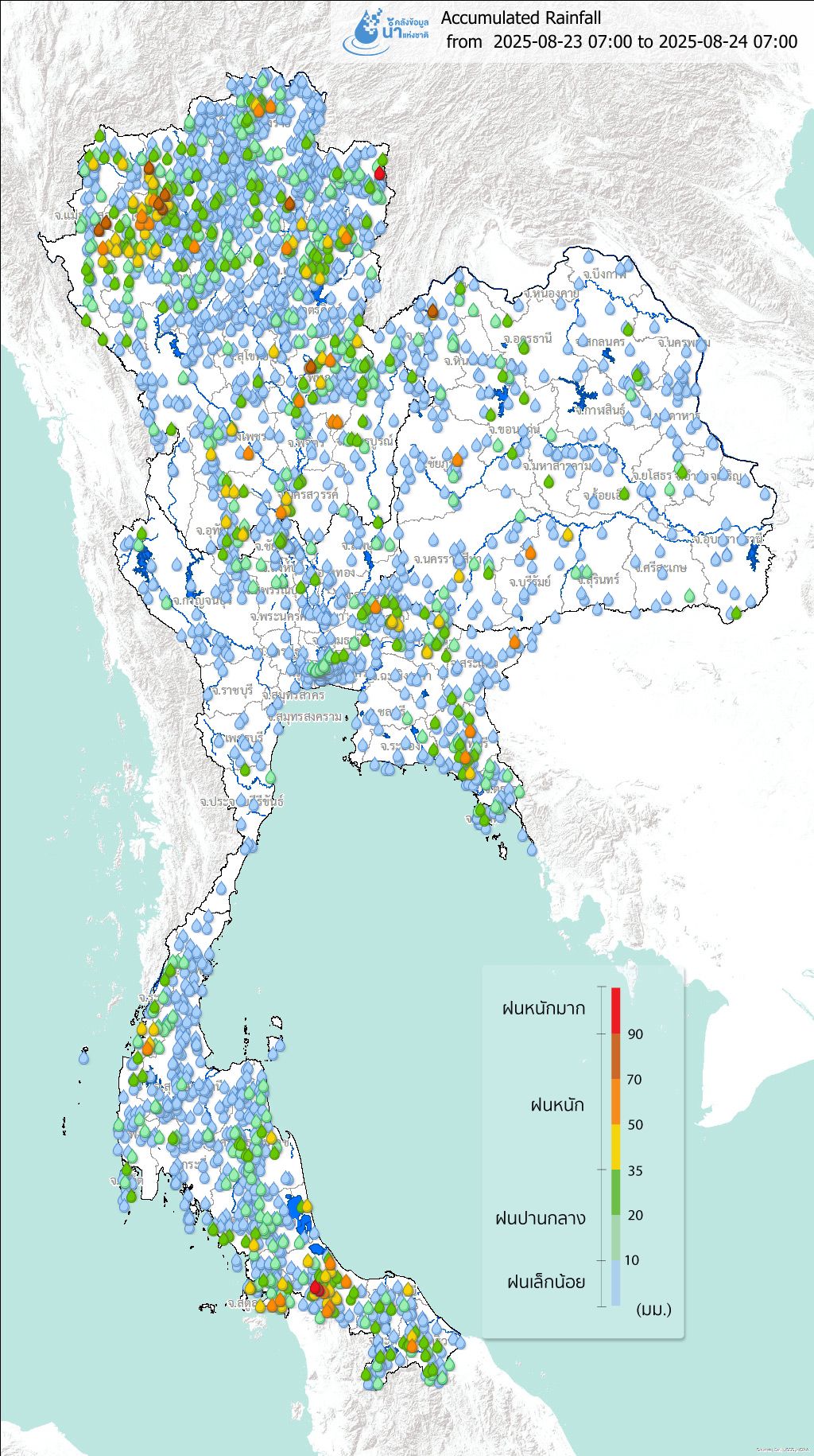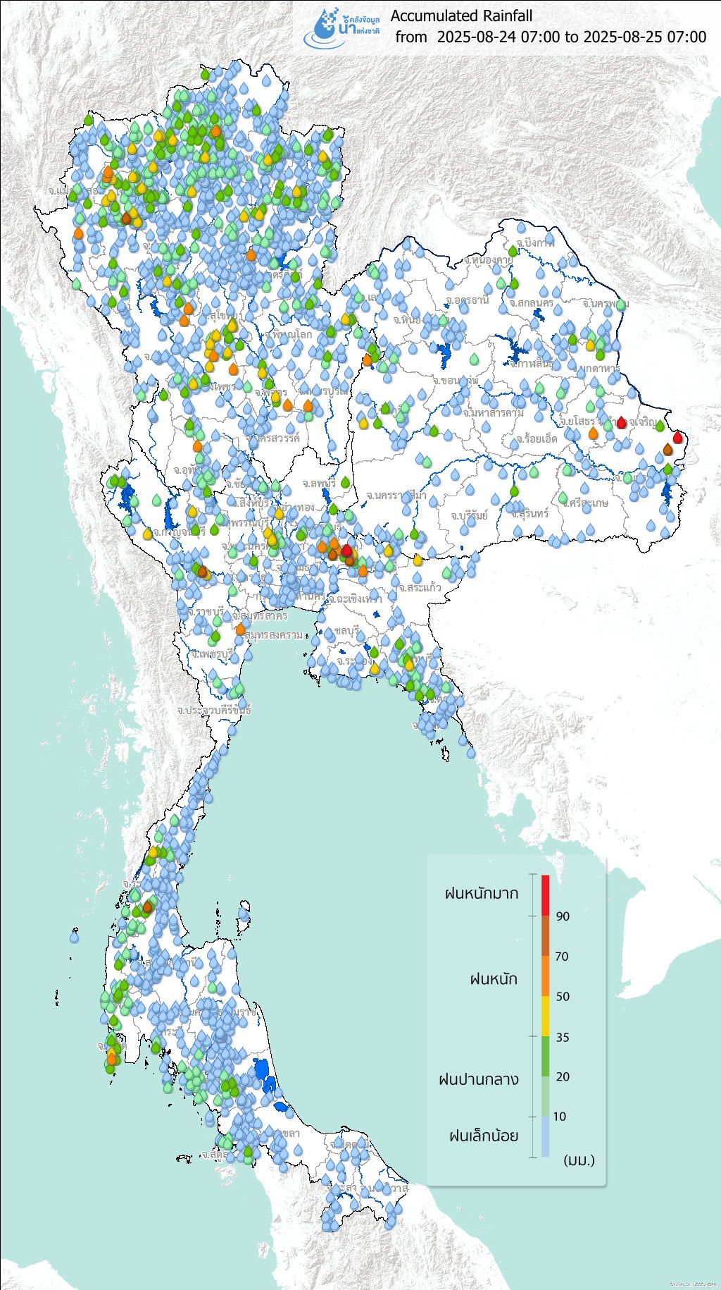 แผนที่แสดงการกระจายตัวของฝนแสดงให้เห็นว่าอิทธิพลจากร่องมรสุมที่พาดผ่านภาคเหนือและภาคตะวันออกเฉียงเหนือรวมทั้งมรสุมตะวันตกเฉียงใต้ที่พัดผ่านทะเลอันดามัน ประเทศไทยและอ่าวไทย ส่งผลทำให้ประเทศไทยมีฝนตกหนักถึงหนักมากเกิดขึ้นกระจายตัวในทุกภาคของประเทศในช่วงวันที่ 21-24 สิงหาคม 2568 สำหรับพายุไต้ฝุ่น “คาจิกิ” เริ่มส่งอิทธิพลทำให้มีฝนตกมากขึ้นในบางพื้นที่ของภาคเหนือและภาคตะวันออกเฉียงเหนือในวันที่ 25