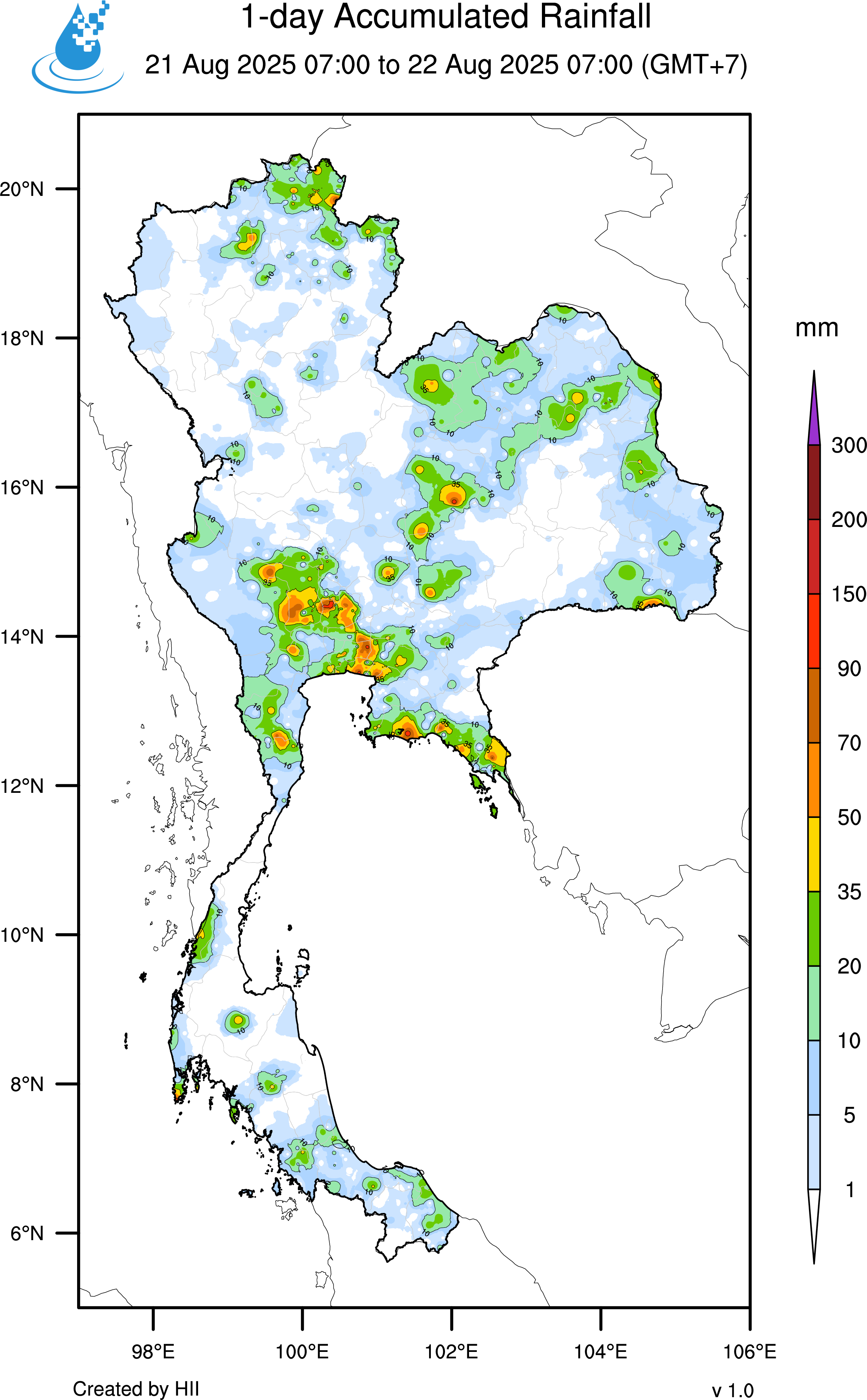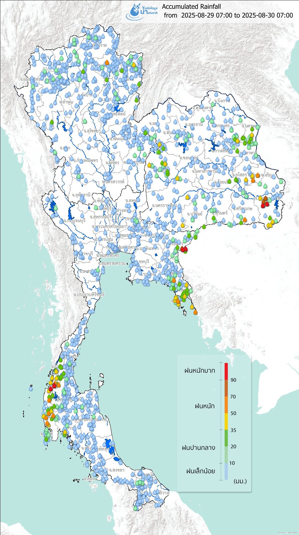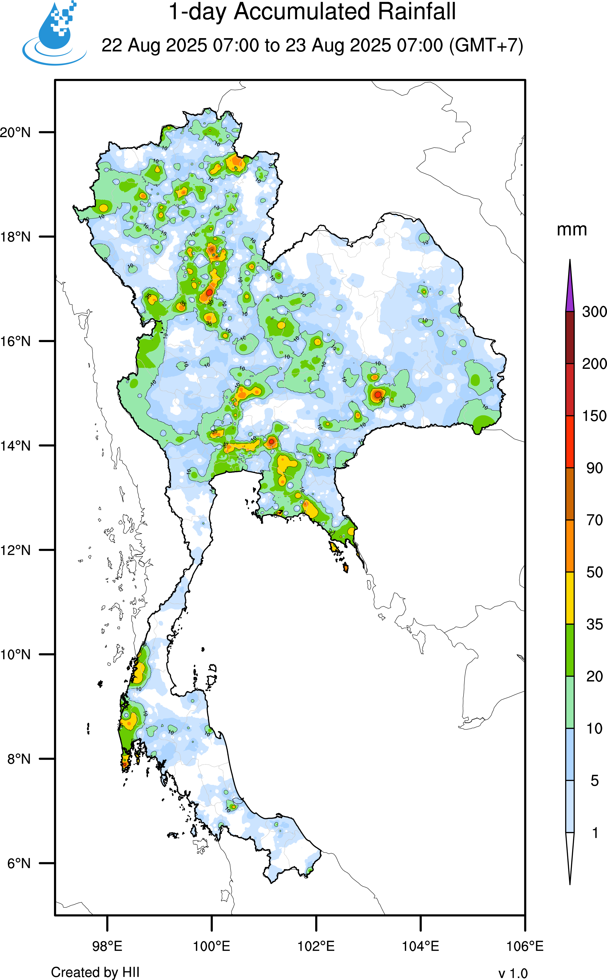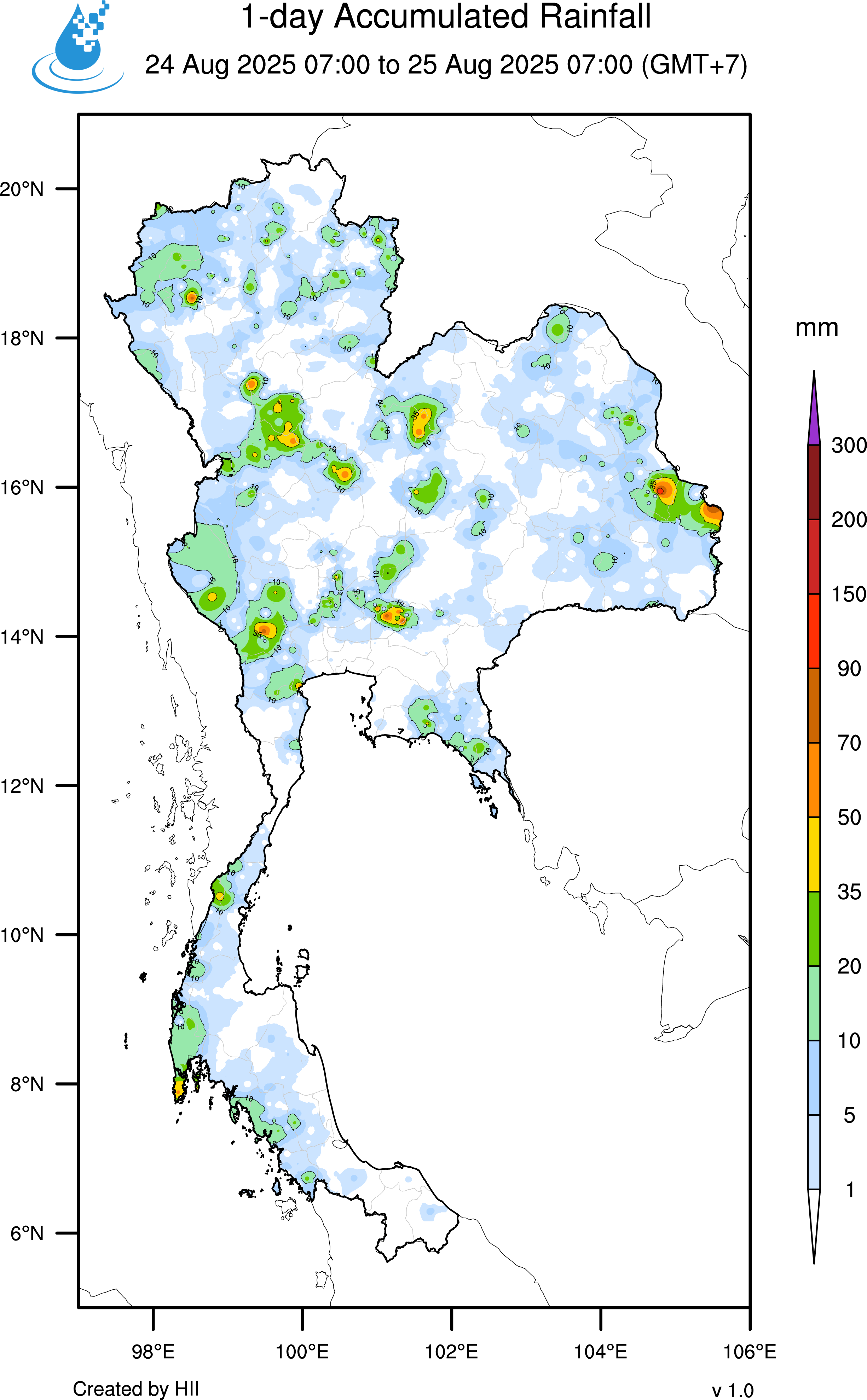 แผนที่แสดงการกระจายตัวของฝนแสดงให้เห็นว่าอิทธิพลจากร่องมรสุมที่พาดผ่านภาคเหนือและภาคตะวันออกเฉียงเหนือรวมทั้งมรสุมตะวันตกเฉียงใต้ที่พัดผ่านทะเลอันดามัน ประเทศไทยและอ่าวไทย ส่งผลทำให้ประเทศไทยมีฝนตกหนักถึงหนักมากเกิดขึ้นกระจายตัวในทุกภาคของประเทศในช่วงวันที่ 21-24 สิงหาคม 2568 สำหรับพายุไต้ฝุ่น “คาจิกิ” เริ่มส่งอิทธิพลทำให้มีฝนตกมากขึ้นในบางพื้นที่ของภาคเหนือและภาคตะวันออกเฉียงเหนือในวันที่ 25