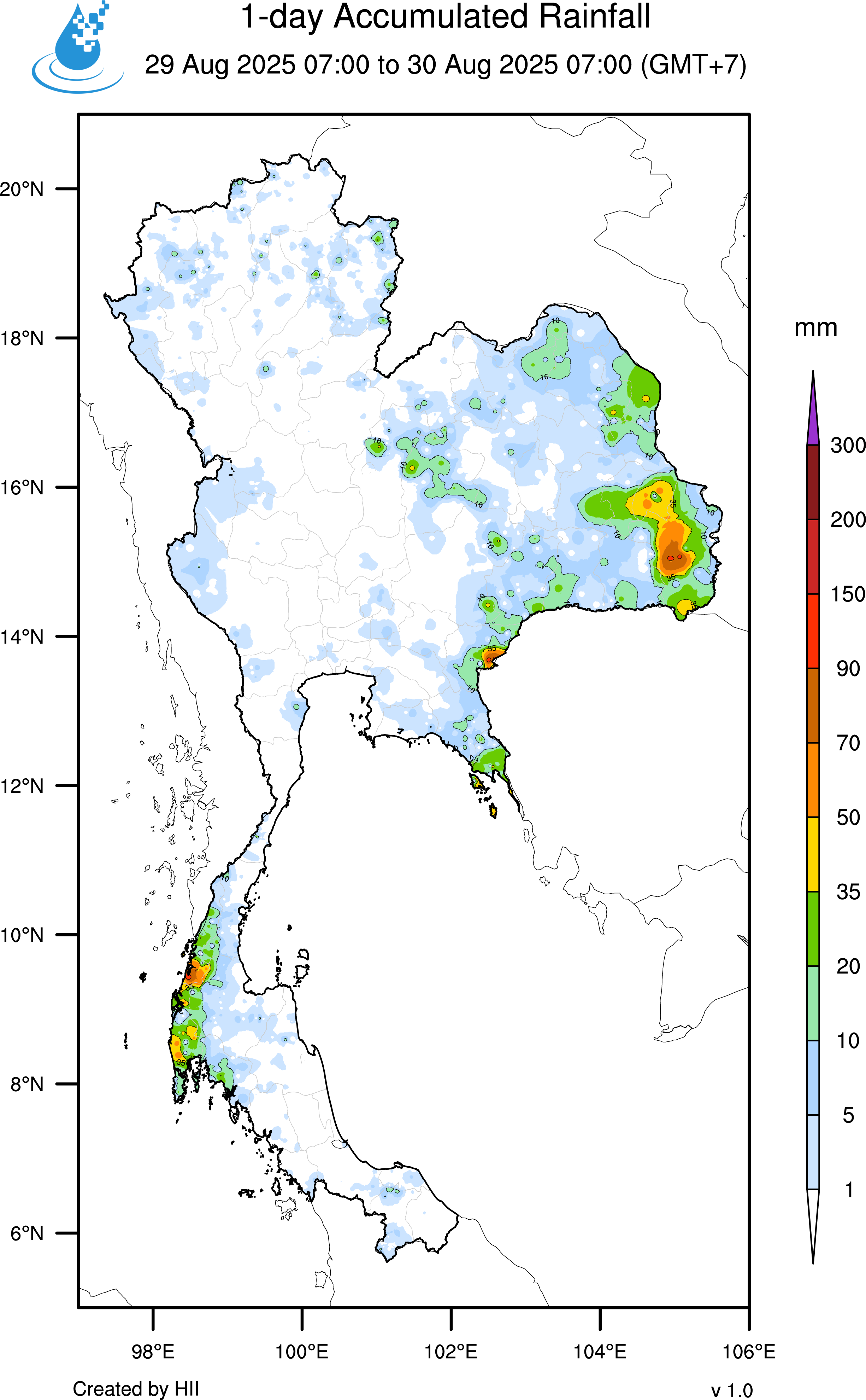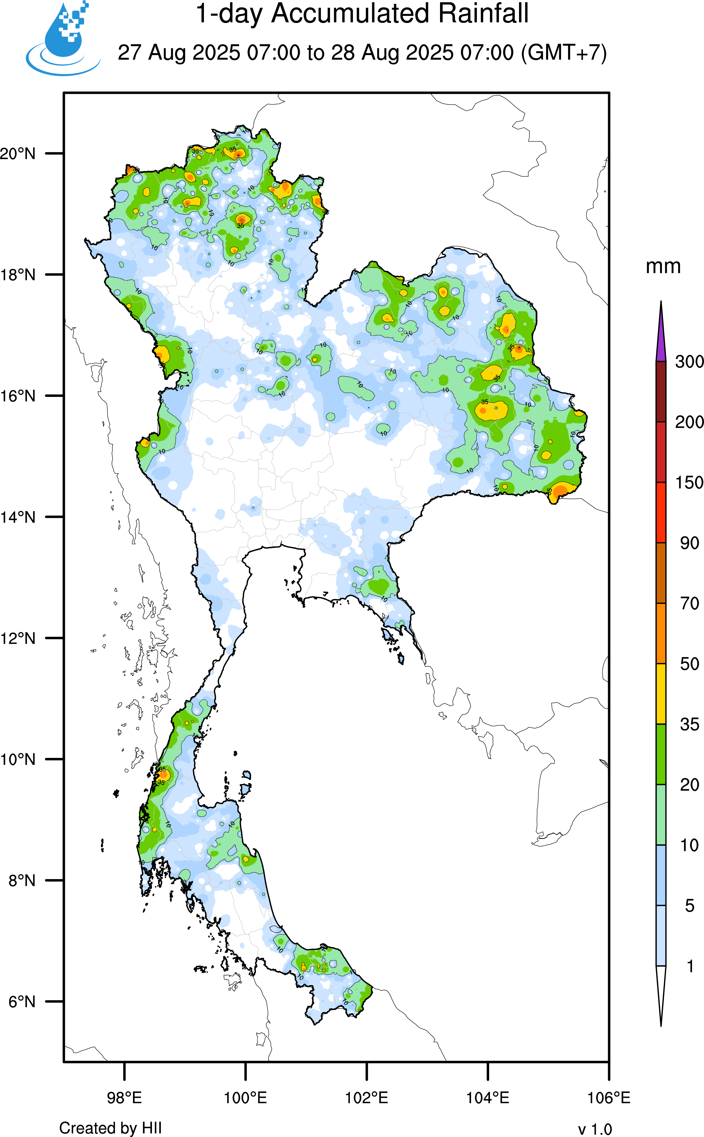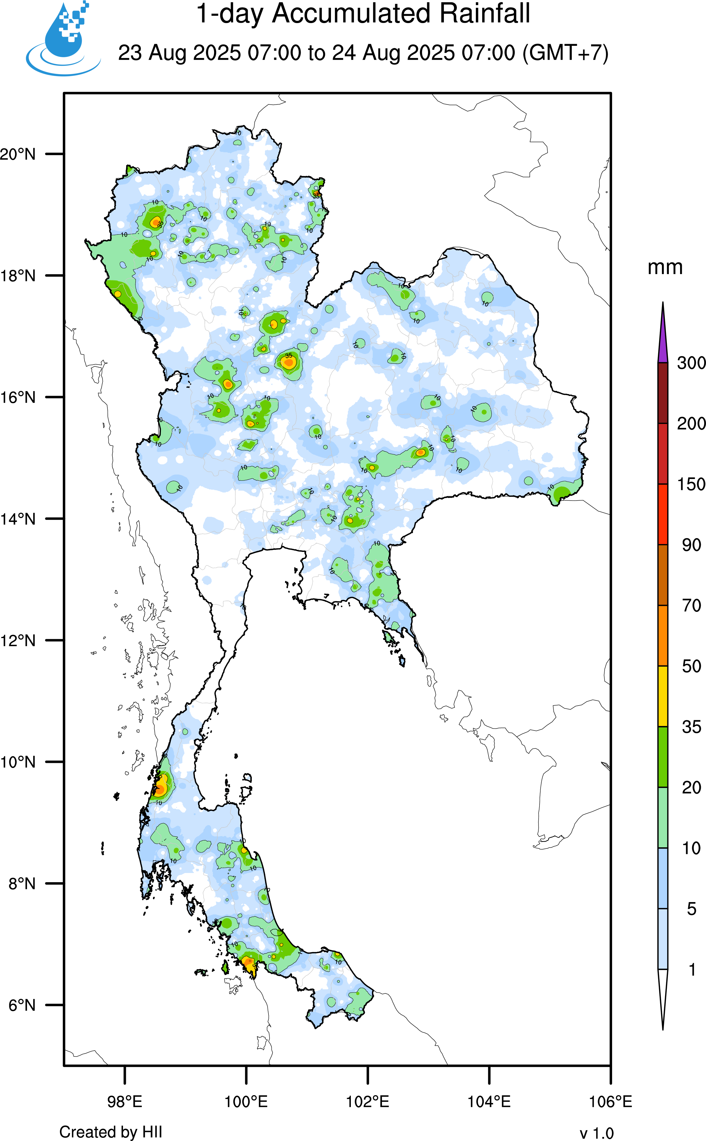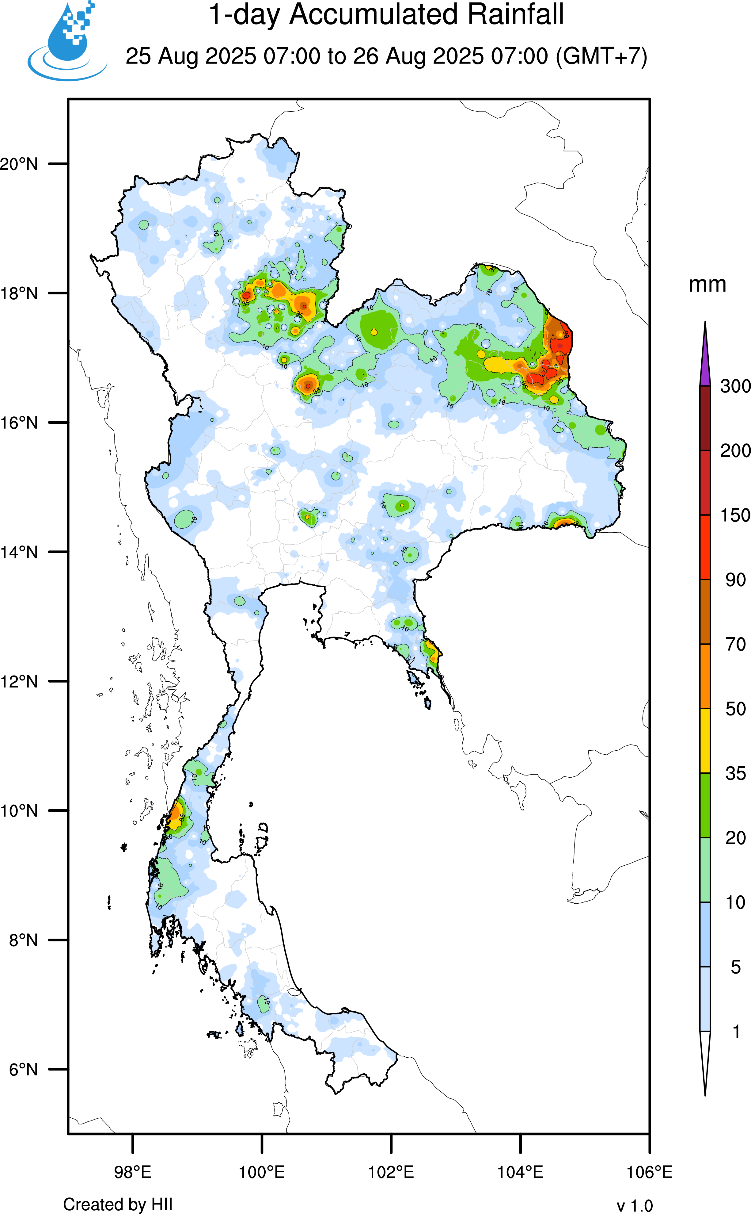 แผนที่แสดงการกระจายตัวของฝนแสดงให้เห็นว่าอิทธิพลจากร่องมรสุมที่พาดผ่านภาคเหนือและภาคตะวันออกเฉียงเหนือรวมทั้งมรสุมตะวันตกเฉียงใต้ที่พัดผ่านทะเลอันดามัน ประเทศไทยและอ่าวไทย ส่งผลทำให้ประเทศไทยมีฝนตกหนักถึงหนักมากเกิดขึ้นกระจายตัวในทุกภาคของประเทศในช่วงวันที่ 21-24 สิงหาคม 2568 สำหรับพายุไต้ฝุ่น “คาจิกิ” เริ่มส่งอิทธิพลทำให้มีฝนตกมากขึ้นในบางพื้นที่ของภาคเหนือและภาคตะวันออกเฉียงเหนือในวันที่ 25