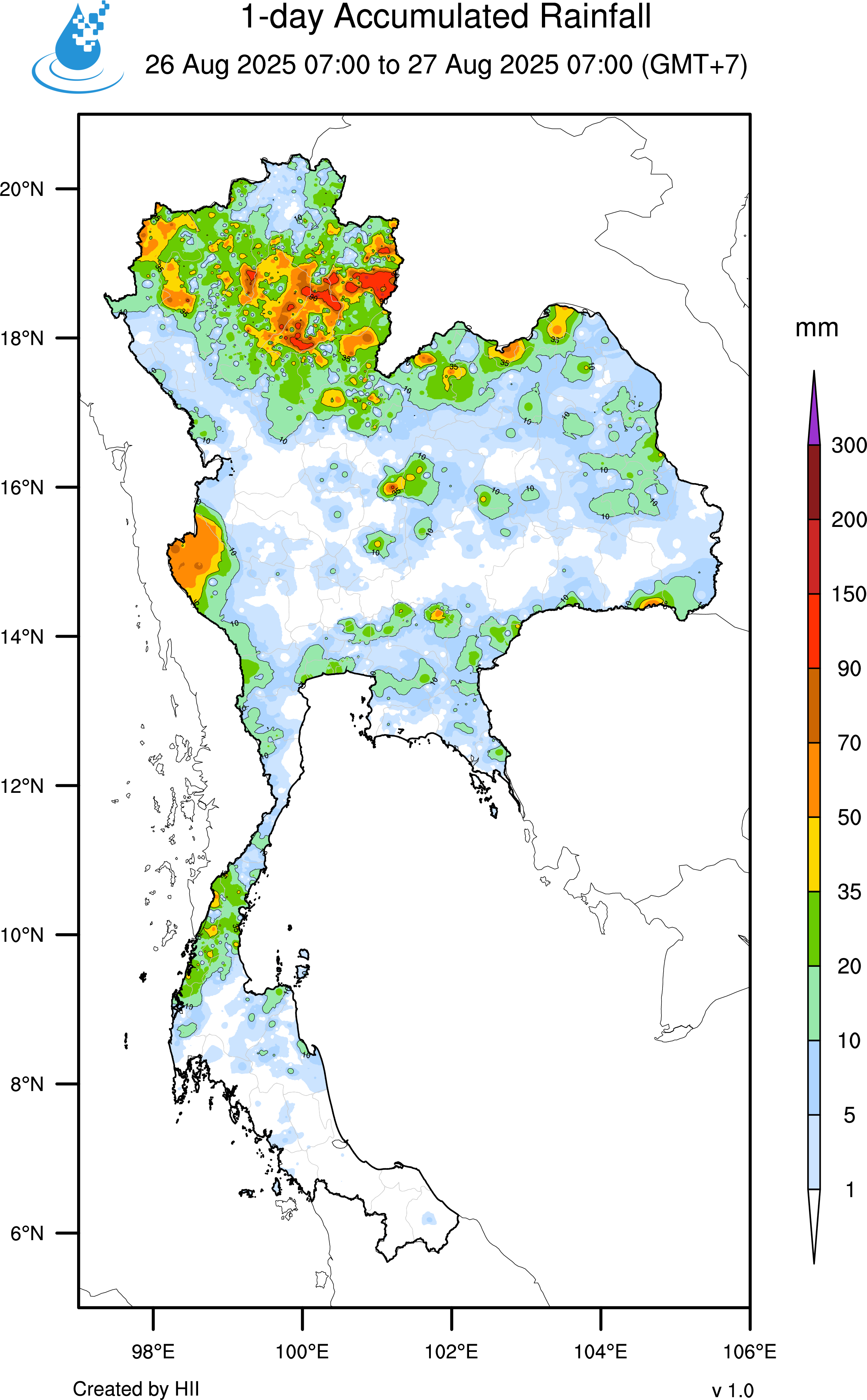 | 26/08/2025 | น่าน | ในเวียง | เมืองน่าน | น่าน | กรมอุตุนิยมวิทยา | 153.60 |