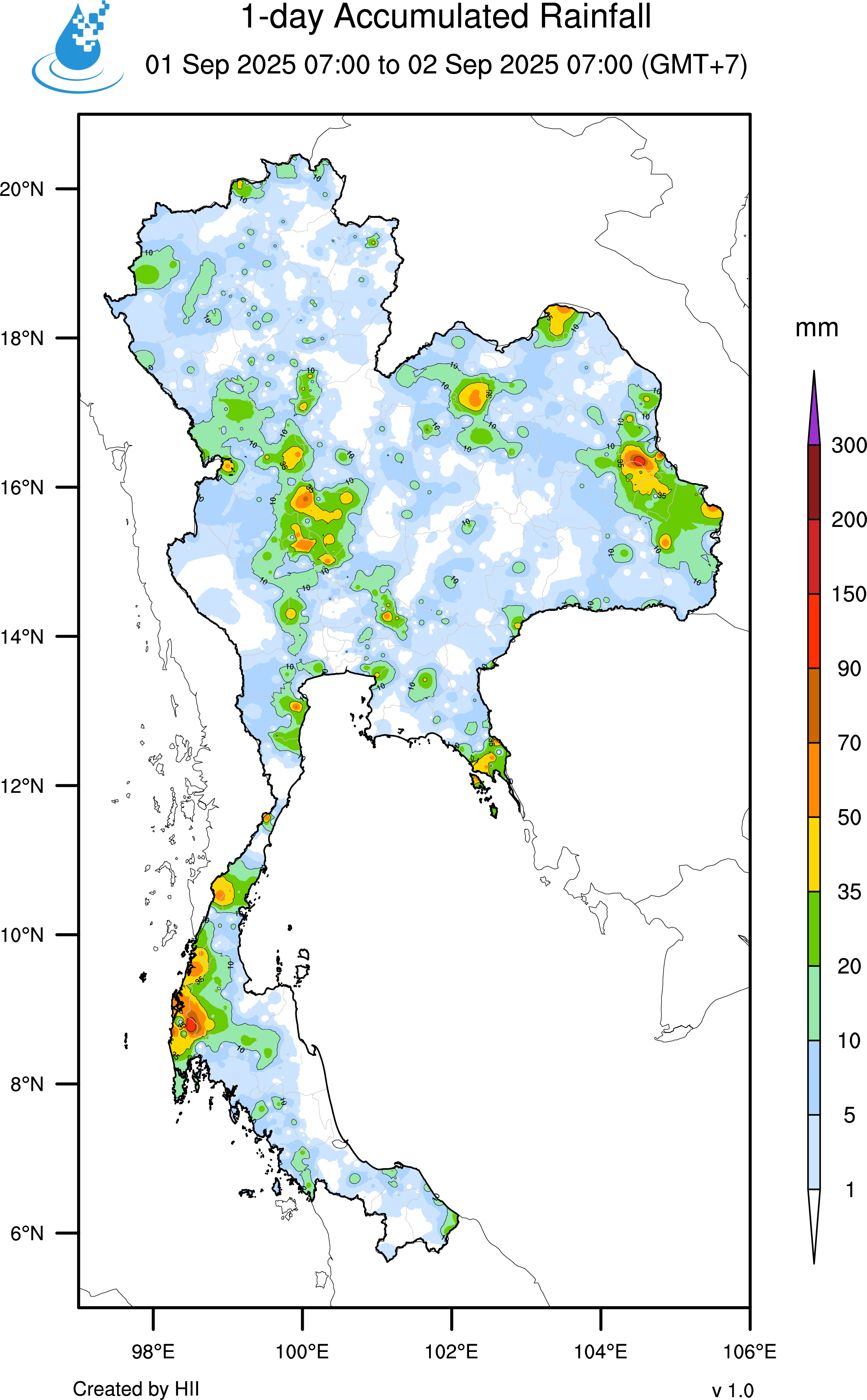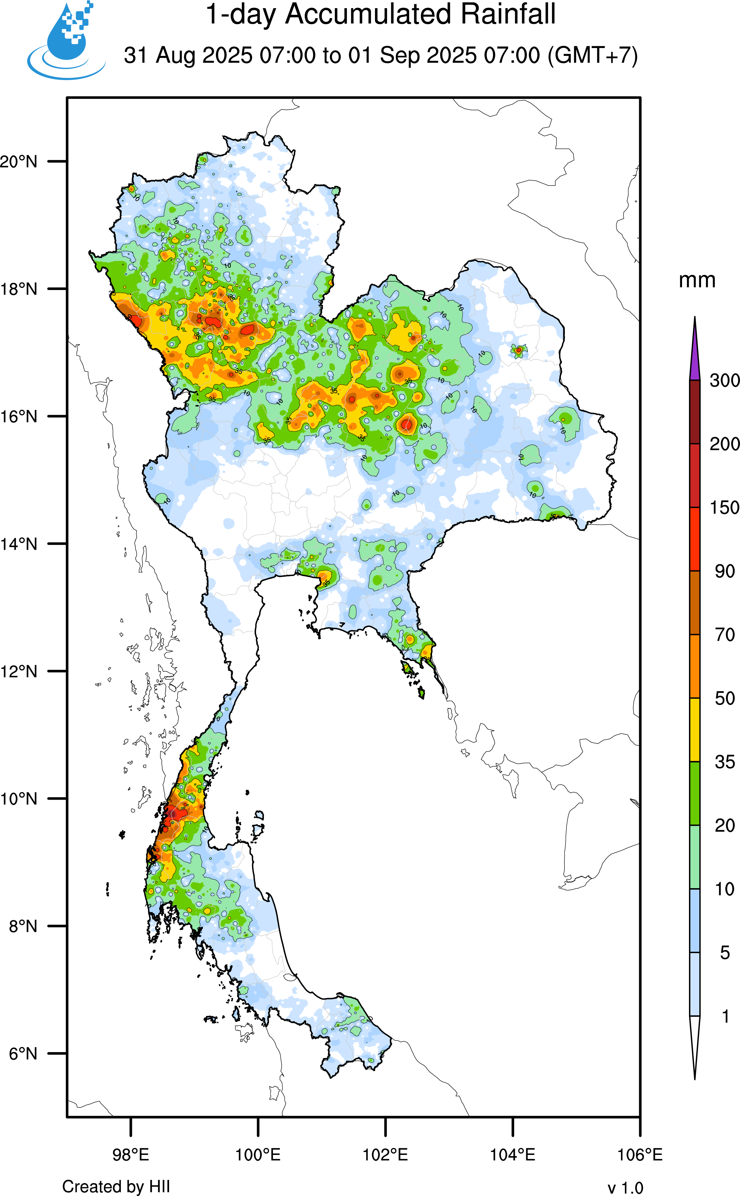 โดยที่สถานีบ้านดอยปุย ต.สุเทพ อ.เมืองเชียงใหม่ จ.เชียงใหม่ มีปริมาณฝนสูงสุดถึง 240 มิลลิเมตร ในวันที่ 8 กันยายน 2568 รองลงมาคือที่สถานีบ้านโป่งตะแบก ต.พุทธบาท อ.ชนแดน จ.เพชรบูรณ์ ปริมาณฝนสะสม 217 มิลลิเมตร ในวันที่ 27 สิงหาคม 2568 สำหรับปริมาณฝนสะสม 7 วัน (ช่วงวันที่ 25-31 สิงหาคม 2568) ที่สถานีบ้านโป่งตะแบก มีปริมาณฝนมากที่สุดเช่นกัน โดยมีปริมาณฝนสะสม 661.5 มิลลิเมตร รองลงมาคือที่สถานีบ้านท่าข้าม ต.แม่ทา อ.แม่ออน จ.เชียงใหม่ ปริมาณฝนสะสม 446.5 มิลลิเมตร รายละเอียดเพิ่มเติมดังแผนที่และตารางด้านล่าง