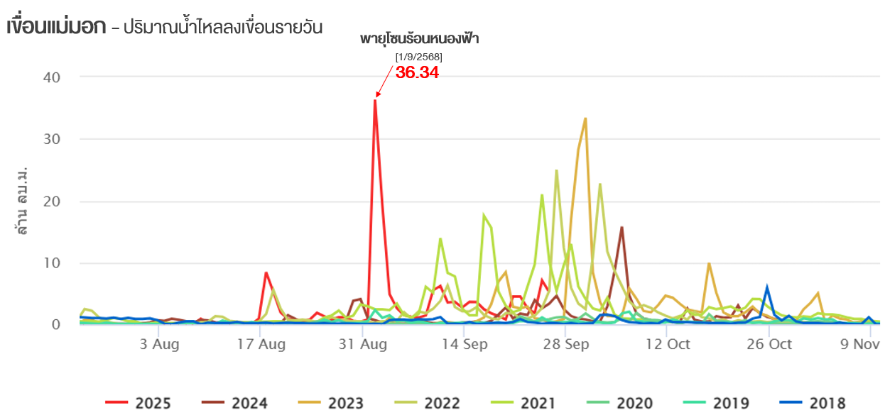 สำหรับเขื่อนแม่มอก มีปริมาณน้ำไหลลงเขื่อนมากถึง 36.34 ล้านลูกบาศก์เมตร ในวันที่ 1 กันยายน 2568 ซึ่งทำให้ปริมาณน้ำกักเก็บในเขื่อนเพิ่มขึ้นอย่างรวดเร็วมาก และเริ่มเกิดสถานการณ์น้ำล้นเขื่อนตั้งแต่วันที่ 2 กันยายน 2568 ต่อเนื่องไปจนถึงต้นเดือนตุลาคม 2568 ซึ่งเป็นสถานการณ์น้ำล้นเขื่อนที่เกิดขึ้นเร็วที่สุดเมื่อเทียบกับข้อมูลในอดีตตั้งแต่มีการสร้างเขื่อน