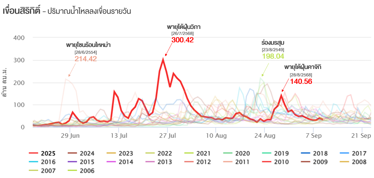 โดยในช่วงที่เขื่อนสิริกิติ์ได้รับผลกระทบจากพายุไต้ฝุ่น “คาจิกิ” และพายุโซนร้อน “หนองฟ้า” ระยะเวลา 7 วัน (ช่วงวันที่ 26 สิงหาคม ถึง 1 กันยายน 2568) มีปริมาณน้ำไหลลงเขื่อนเพียง 594 ล้านลูกบาศก์เมตรเท่านั้น โดยมีปริมาณน้ำไหลลงเขื่อนรายวันสูงสุด 140.56 ล้านลูกบาศก์เมตร ในวันที่ 28 สิงหาคม 2568 ซึ่งน้อยกว่าช่วงที่ได้รับผลกระทบจากพายุวิภาอยู่ค่อนข้างมาก ที่มีปริมาณน้ำไหลลงเขื่อนรายวันสูงสุดถึง 300.42 ล้านลูกบาศก์เมตร ซึ่งเกิดในช่วงเวลาเพียง 5 วัน แต่มีน้ำไหลลงเขื่อนสะสมถึง 122 ล้านลูกบาศก์เมตร