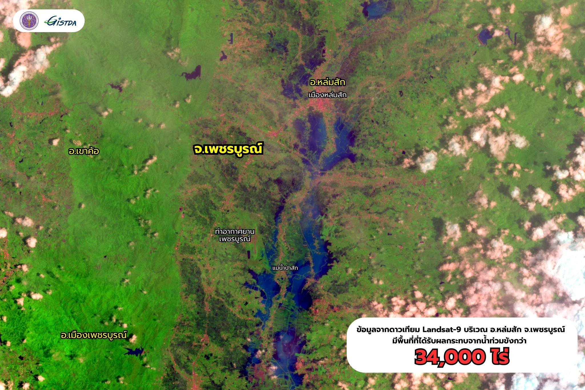 จากการวิเคราะห์ภาพถ่ายดาวเทียมในช่วงวันที่ 23 สิงหาคม ถึง 8 กันยายน 2568 ซึ่งเป็นช่วงที่ประเทศไทยได้รับอิทธิพลจากทั้งพายุไต้ฝุ่น “คาจิกิ” และพายุโซนร้อน “หนองฟ้า” ดาวเทียมตรวจพบพื้นที่ถูกน้ำท่วมถึง 1.77 ล้านไร่ ใน 31 จังหวัด ประกอบด้วย