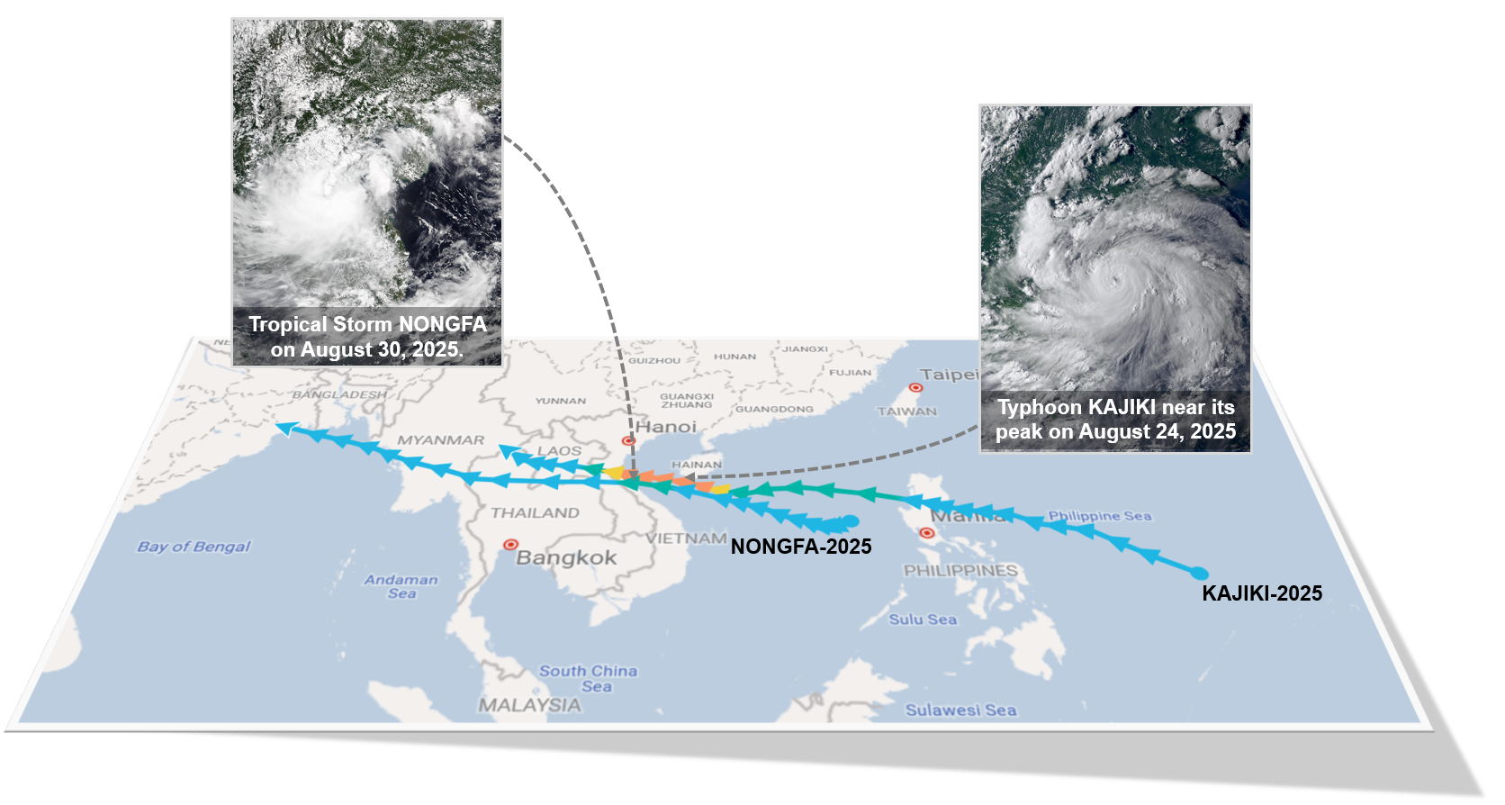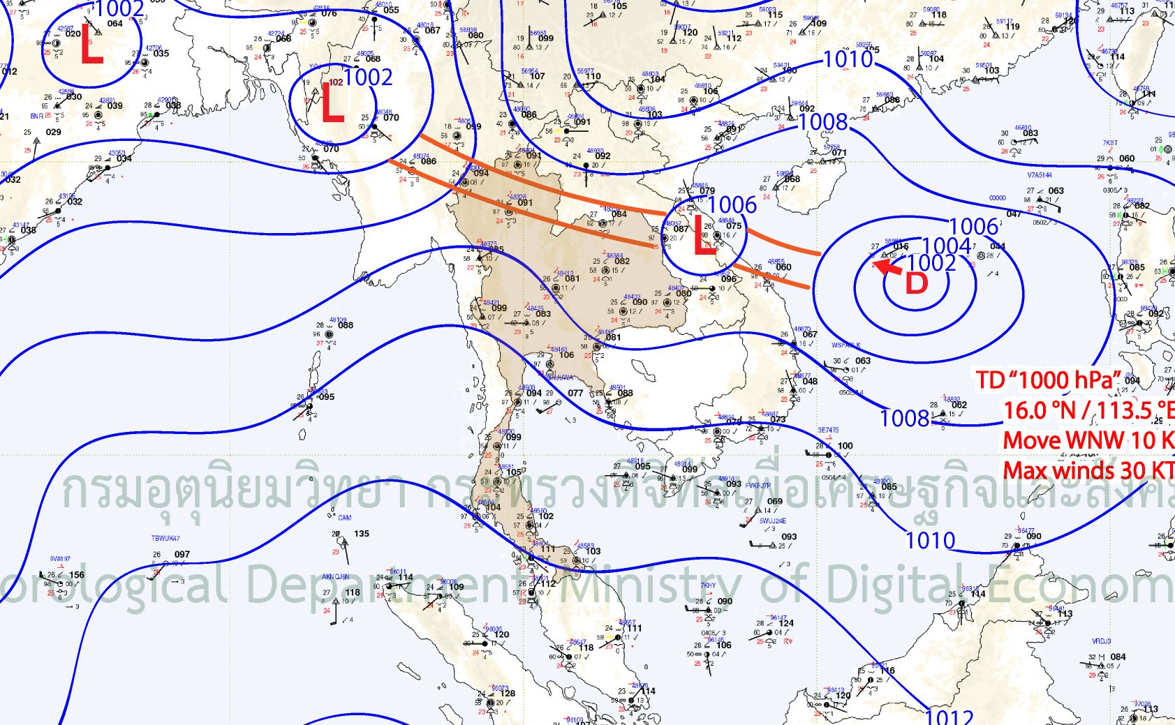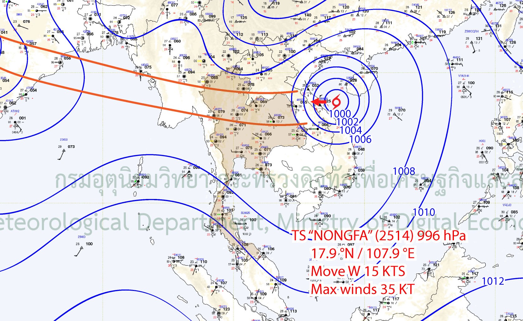 Later, on 26 August 2025, Typhoon KAJIKI moved into Vietnam and dissipated into low-pressure area that resulted in the reformation of monsoon trough lay across the North and the Northeast of Thailand on 27 August 2025. At the same time, the low-pressure area occurred in the South China Sea near the coast of the Philippines. On the following day, the monsoon trough extended across the North of Thailand toward this low-pressure area, which later intensified into Tropical Depression “NONGFA” on 29 August 2025.